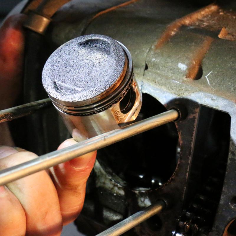ピストンにはトップリング、セカンドリング、オイルリングの3つのピストンリングがついています。ピストンリングの役割は、ピストンとシリンダ(気筒)内壁との間の気密を保つ働きと、シリンダ壁の潤滑油をかき落として燃焼室に入らないようにする働きもあります。この事例車両のように、ピストン周りにスラッジ(酸化物質)が溜まると、ピストンリングが正常に動けなくなり、気密性の低下やオイルが燃焼室に入るなどが起こります。それにより、排気ガスが臭い、白煙が出る、走りに力がない等の症状が出ます。オイル上がりにより燃焼室にカーボンが溜まると、カーボンがバルブに挟まる「カーボン噛み」の原因にもなり、最悪の場合は走れなくなります。SOD-1Plusの洗浄力により汚れを分解洗浄することで、機械内部が正常に動ける状態に戻します。更に耐摩耗性の強い油膜により、金属同士の接触による摩耗を防ぎ、かつスムーズな動きをサポートします