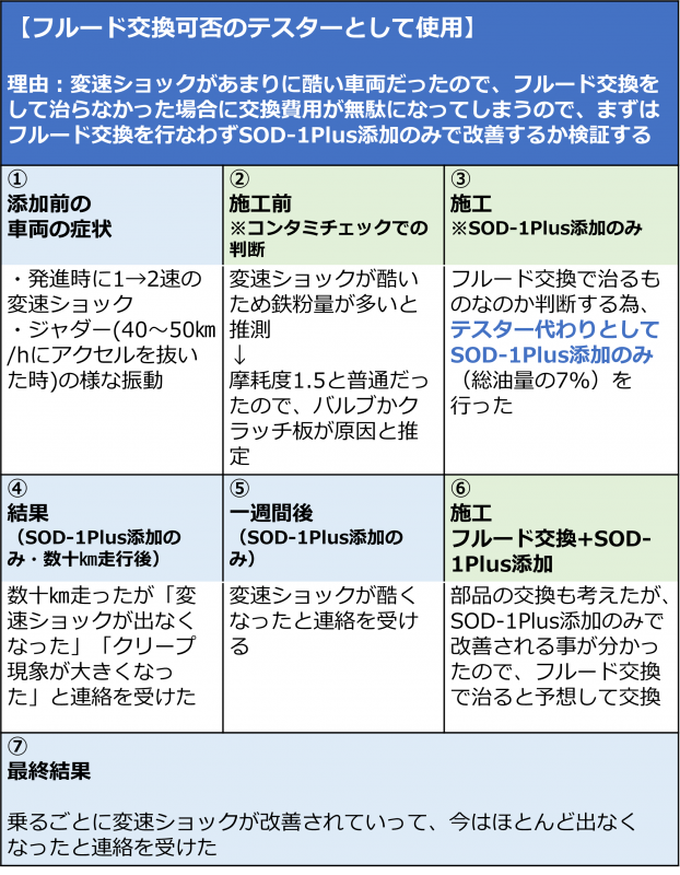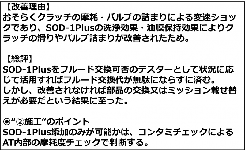 おそらくクラッチの摩耗・バルブの詰まりによる変速ショックでありSOD-1 Plusの洗浄効果・油膜保持効果によりクラッチの滑りやバルブ詰まりが改善されたことが分かった。