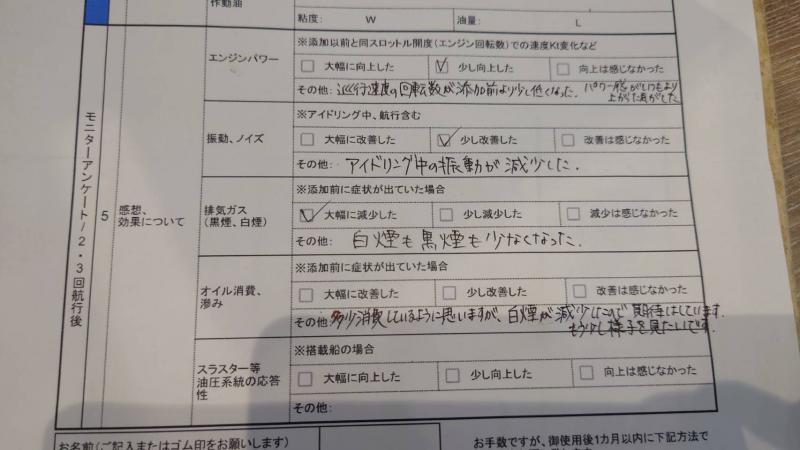 ③改善効果によりオイル上がりの防止、正常な燃焼を行う事による各種排ガスの煙減少。