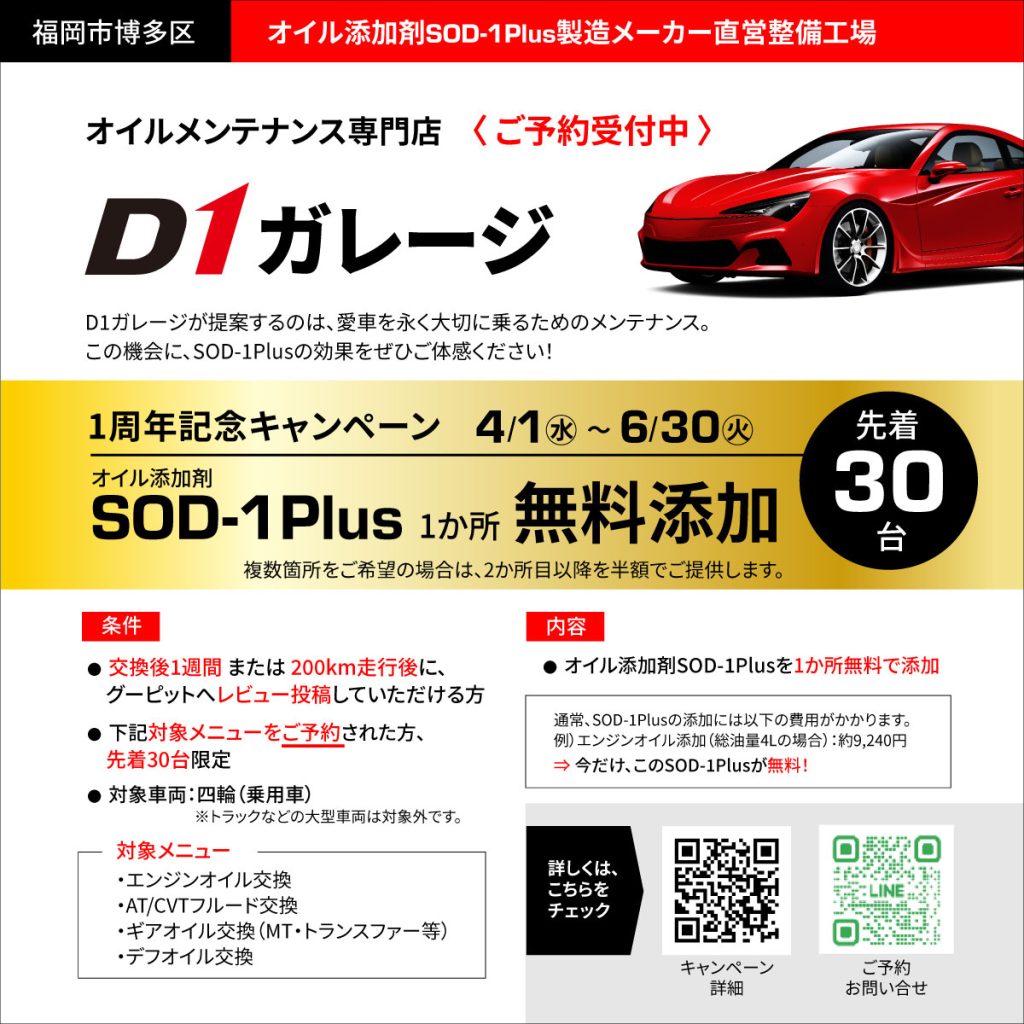 【D1ガレージ1周年】先着30台限定「SOD-1Plus 1か所無料添加」キャンペーンを4/1開始(6/30まで)