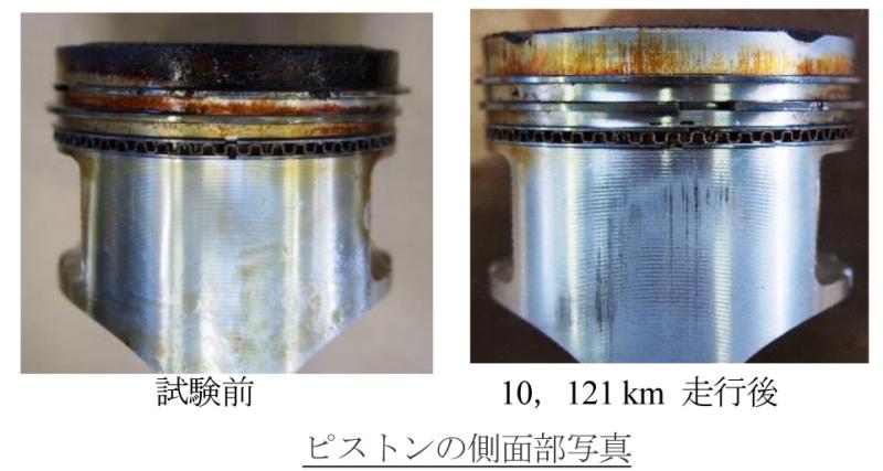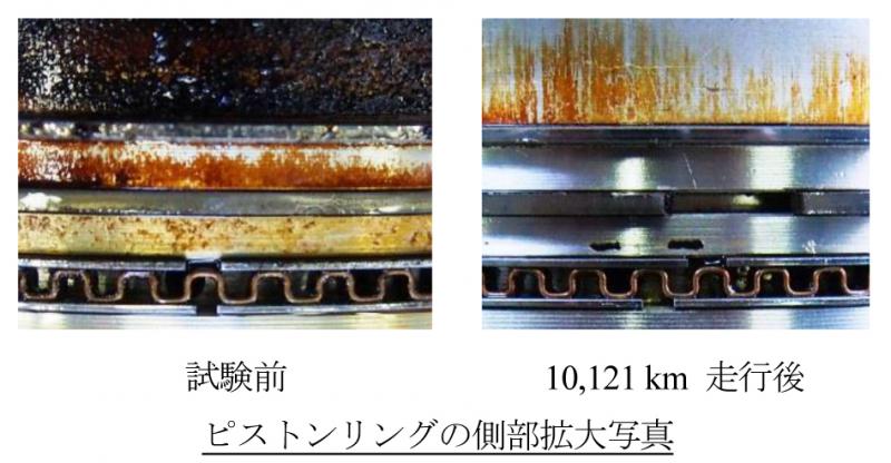中古軽自動車の車検整備後,純正エンジンオイルに交換して約1,000 km走行後にエンジンを分解して内部点検をした。その後,エンジンを組み立てて新還元添加剤を10vol%添加して平均50km/hで10,121 km走行後に開放点検をした。その結果,新還元添加剤の添加後は各所に清浄効果が現れており,特にシリンダボディのオイル通路孔に蓄積していた閉塞気味のヘドロ状のスラッジがほぼ清浄,除去されていた点は注目の効果であった。ピストンについては,図3に示す側面写真からクラウン部はもとよりトップランドのスラッジ類が著しく分解,清浄され,1stと2ndピストンリングの固着解放による復元とオイルリングの清浄が認められる。