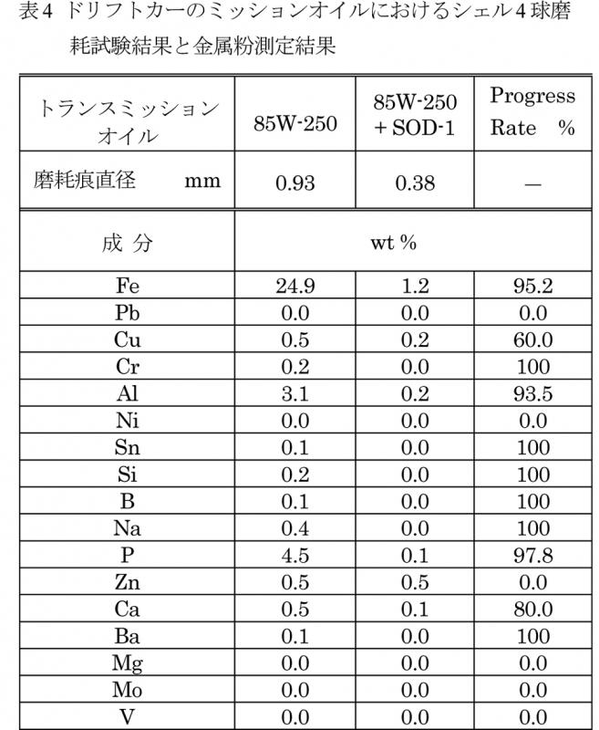 最近,ドリフト競技が脚光を浴びているが,従来のモータースポーツと比較してかなり過酷なレースで,スタートから500 mを10 sec前後で約200 km/hに急加速後,急減速に耐えるエンジンとトランスミッション等に対する高度な耐久性と耐摩耗性を要求される。この車両のミッションオイルに新還元添加剤の有無について各々2時間走行して,そのオイルのシェル四球摩耗試験と元素分析を実施した結果を表4と図4に示す。