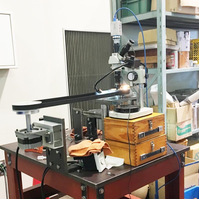 左写真試験機の接触面をハイスピードカメラで映し、縞字数を観測することにより油膜厚さを求める。