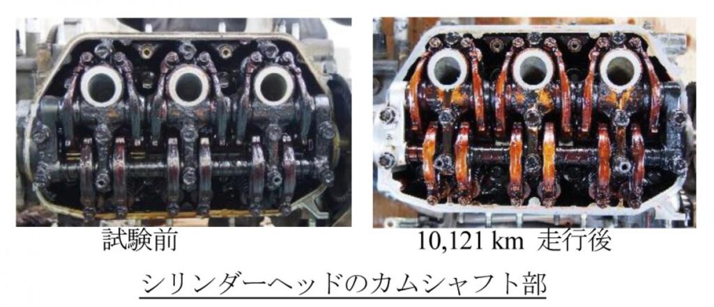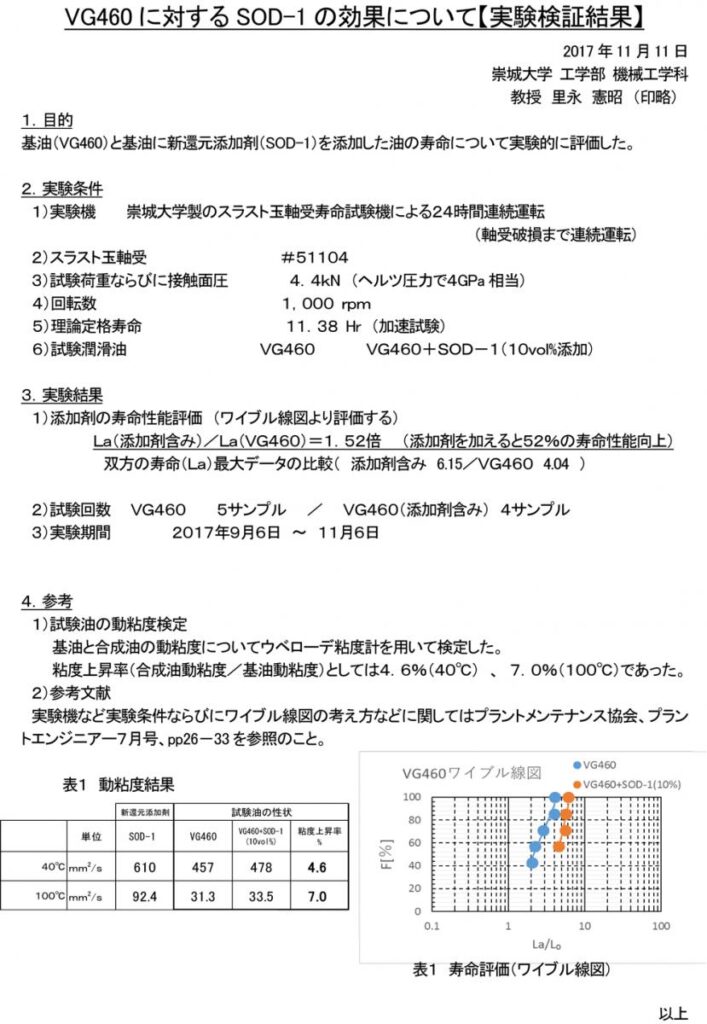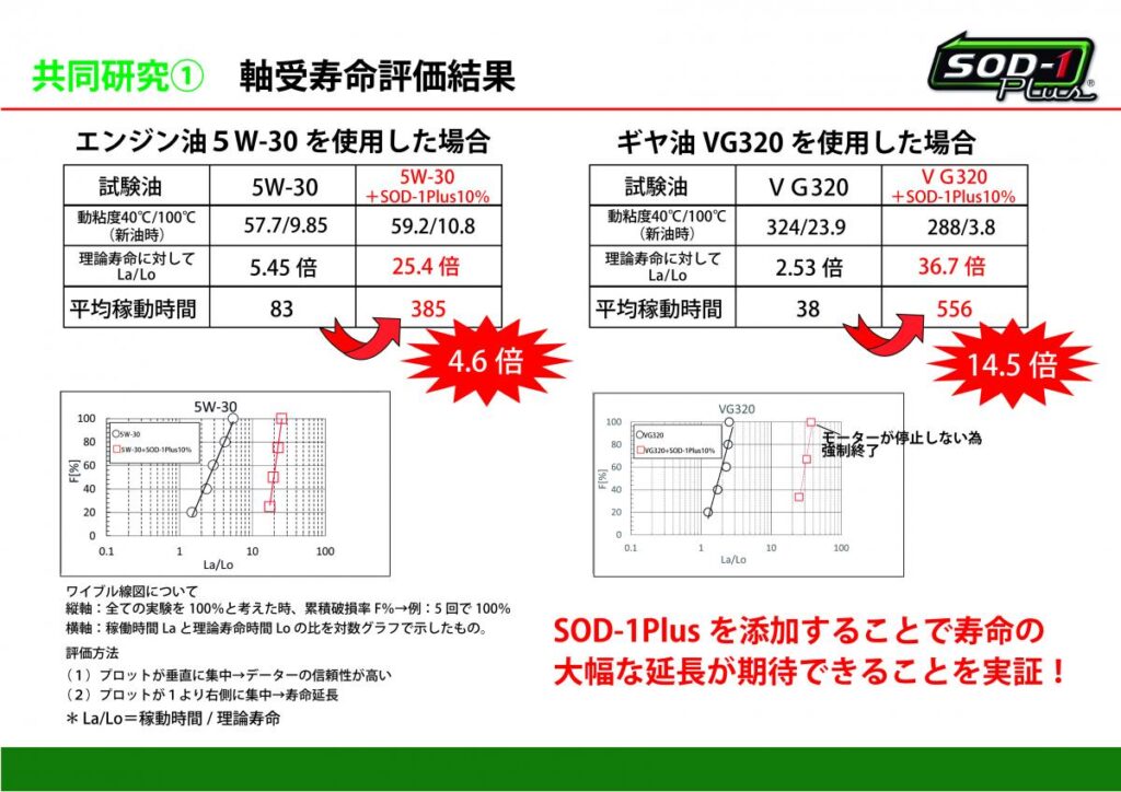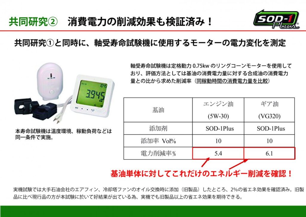 エンジン油である5W-30に関しては基油に対する合成油の消費電力量の割合として、寿命試験機で96.1%となり3.9%の削減を確認した。また、ギヤ―油であるVG-320に関しては基油に対する合成油の消費電力量の割合として寿命試験機で94.9%となり、5.1%の削減、さらに同様な視点として生産用実機(減速機)で98%となり2.0%の削減を確認した。温度環境、生産負荷などは同一条件であり、このことを言い換えれば、新還元添加剤(SOD-1Plus)を添加することにより簡単に省エネルギーを得られるという期待が持てることを示している。