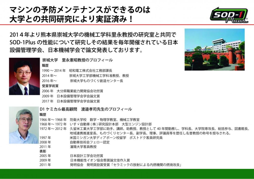 数年前より、SOD-1Plusの効果を実証するため、久留米工業大学副学長・理事を歴任され、ディーゼルエンジンの開発に大きく貢献されてきた渡邉孝司名誉教授と崇城大学工学部機械工学科の里永憲昭教授との共同研究をしています。